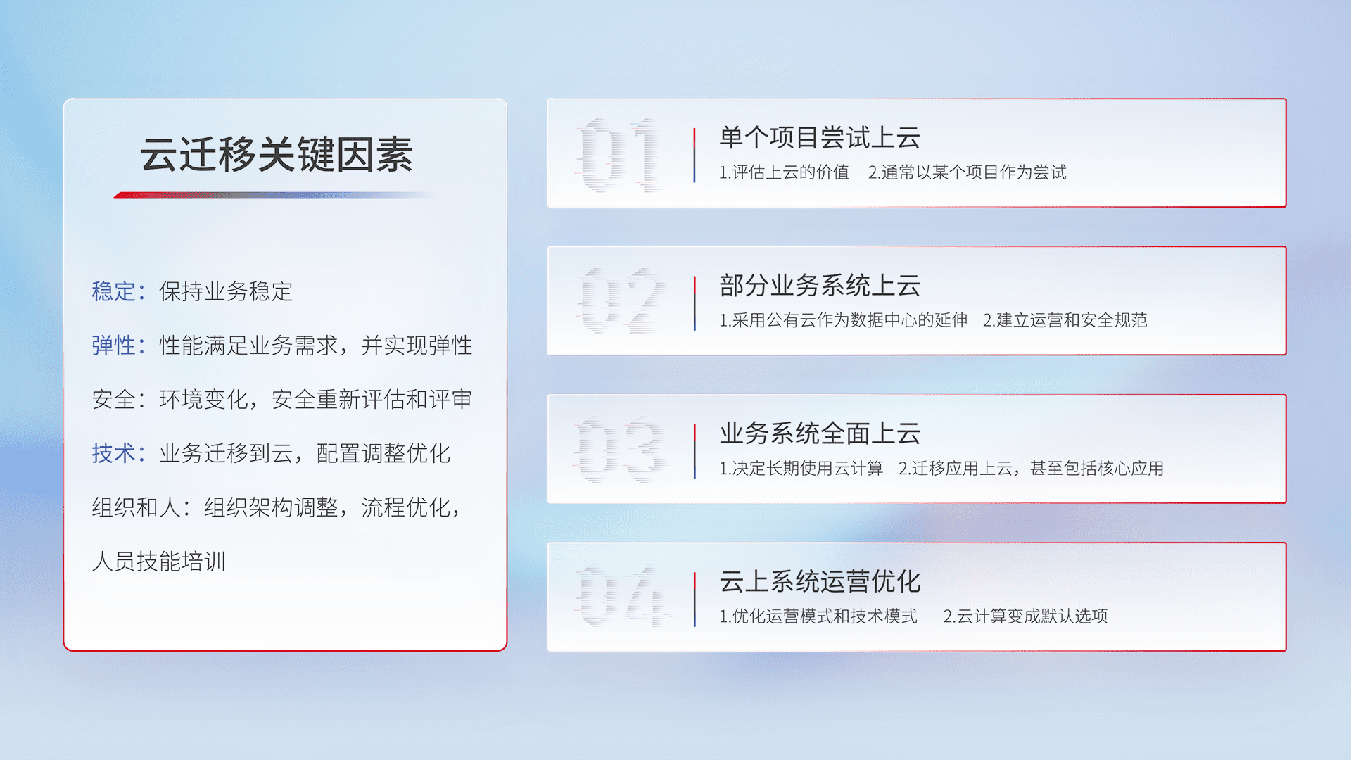 结合实际业务,,,,从规划设计、、云平台选型、、、云原生改造、、、、数据迁移、、、集成交付,,,,迁移全过程为客户识别最佳上云路径,,,做好风险识别管理,,,,设计网络架构、、、、身份权限、、、、安全审计合规、、操作审计、、、、日志审计、、、、监控告警策略、、多站点容灾设计等,,,,对云上基础设施进行整体规划,,提升IT治理水平,,,以满足弹性、、、、高可用、、、高性能的需求。。。