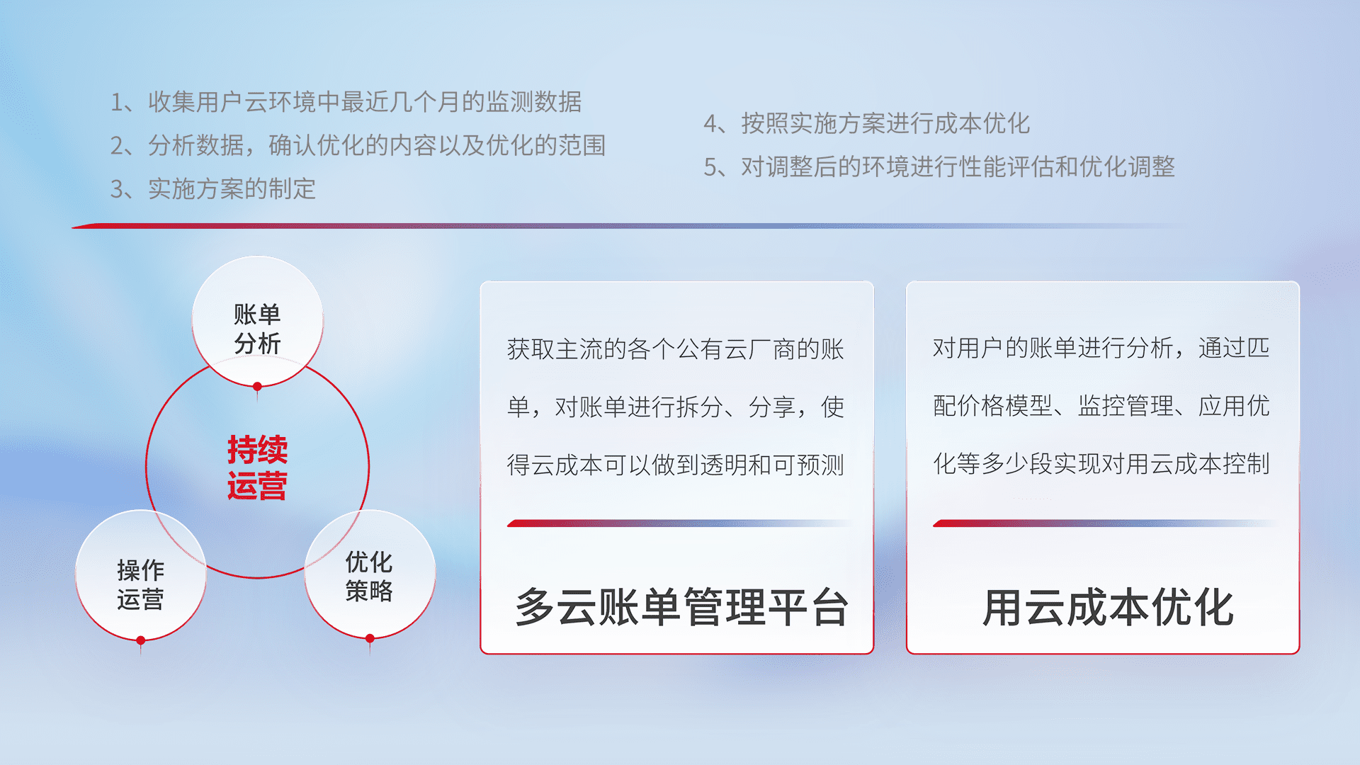 通过多云纳管,,以统一的资源数据模型把客户的云资源进行抽象和封装,,,进而实现对多云资源的统一操作,,保障云资源管理的可靠性、、稳定性与可用性。。。。量身定制化运维内容,,,配置、、开发运维、、补丁管理、、、备份、、、、监控、、、认证和访问管理、、审计和日常巡检等,,,保障在用云过程中的可靠度,,稳定度以及高可用率。。