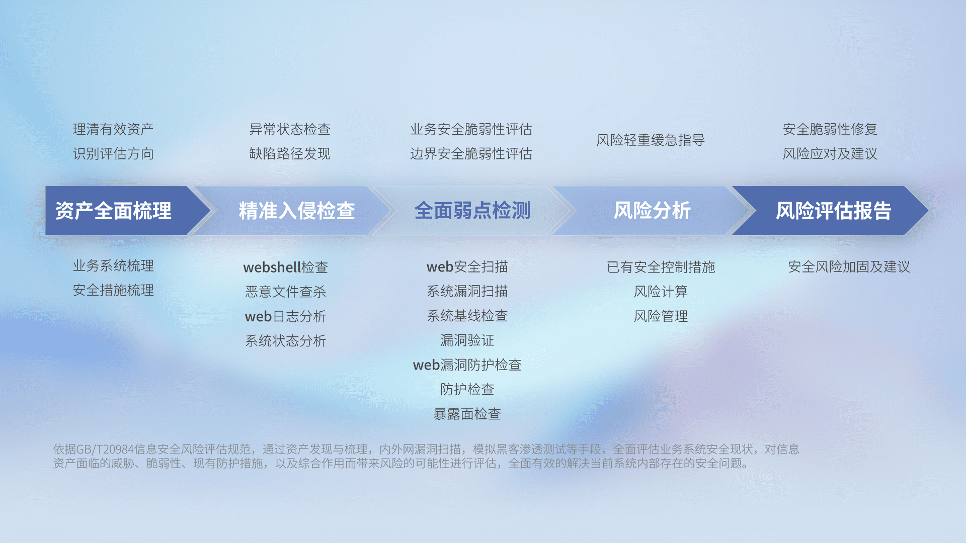 针对客户行业特性,,,,以专业的安全服务+多厂商联合解决方案提供专属的一站式安全管理服务,,,,帮助客户全面感知网络空间威胁,,,基于识别、、检测、、、分析、、、、防护、、、、监测、、、、响应的服务理论模型,,,从方案咨询、、、、集成交付、、评估验证、、、优化加固、、、、运维运营,,,,致力于为客户提供完整的闭环管理式安全服务。。。以实战经验为客户打造高抵御风险的安全体系,,帮助客户发现威胁、、、对抗威胁、、、、处置威胁,,不断积累安全对抗能力,,,持续保障数字化安全。。